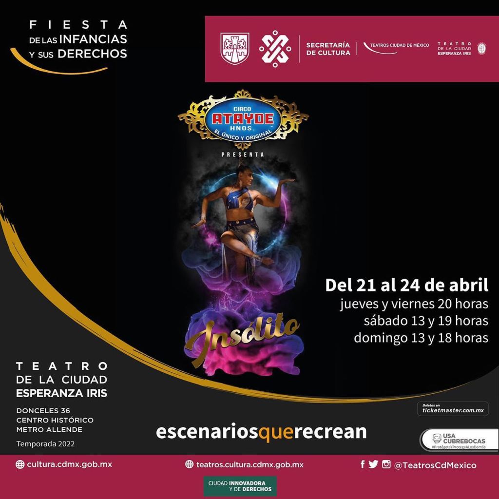 El Único y Original Circo Atayde Hnos. presenta: Insólito se llevará a cabo los días jueves 21 y viernes 22 de abril a las 20:00 horas, sábado 23 a las 13:00 y 19:00 horas, y domingo 24 a las 13:00 y 18:00 horas, en el Teatro de la Ciudad Esperanza Iris (Donceles 36, Centro Histórico, Metro Allende), con las disposiciones del semáforo epidemiológico vigente: uso permanente de cubre-bocas, gel anti-bacterial y registro de código QR por parte tanto del personal del teatro como de los espectadores.