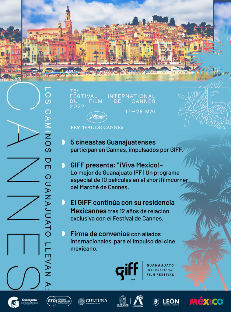 Dentro de su participación en la 75 edición de Cannes, GIFF presentará un programa con 10 películas en el Short Film Corner, un espacio dedicado a la venta, exhibición y distribución de cortometrajes del Marché de Cannes, se trata de una selección especial llamada “¡Viva México! Lo mejor de Guanajuato IFF”.