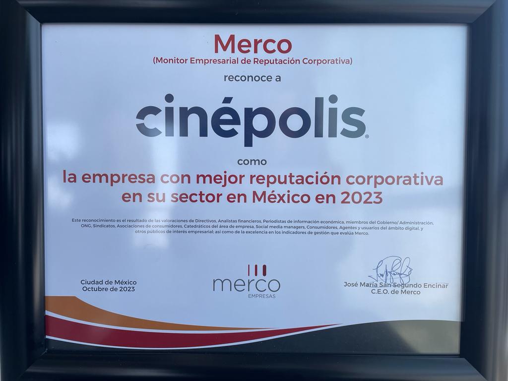 Cinépolis, empresa global mexicana con más de 50 años de historia, fue reconocida como Líder en el sector Ocio y Entretenimiento por segundo año consecutivo. La entrega de esta condecoración se realizó durante la 11a edición de Merco Empresas y Líderes México. En dicho evento, se dan a conocer las 100 empresas con mejor reputación corporativa en el país, las cuales son presentadas por el director corporativo de MERCO, Antonio Lechón Cruz, e Itzel Torres Ruiz, directora general de MERCO México.