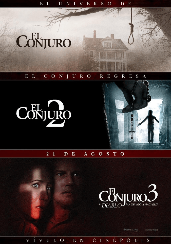 El universo cinematográfico más escalofriante estará nuevamente en cines gracias a Warner Bros. y Cinépolis +QUE CINE, con el reestreno de la trilogía de El Conjuro. Tres horríficas historias basadas en expedientes reales que atormentaron a los investigadores paranormales más famosos del cine moderno: Ed y Lorraine Warren. Este estreno exclusivo estará disponible en salas seleccionadas a partir del 21 de agosto, y la preventa Cinépolis iniciará el 31 de julio, a través de la App y el sitio oficial.