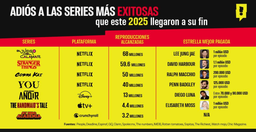 Series como Andor, protagonizada por Diego Luna, quien se llevó entre 70 y 90 mil dólares por episodio al dar vida al Capitán Cassian Andor, El cuento de la criada que coronó a la actriz Elisabeth Moss como una de las mejores pagadas en streaming cobrando 1 millón de dólares por episodio en sus últimas temporadas y My Hero Academia, también se posicionaron como las favoritas de la audiencia.