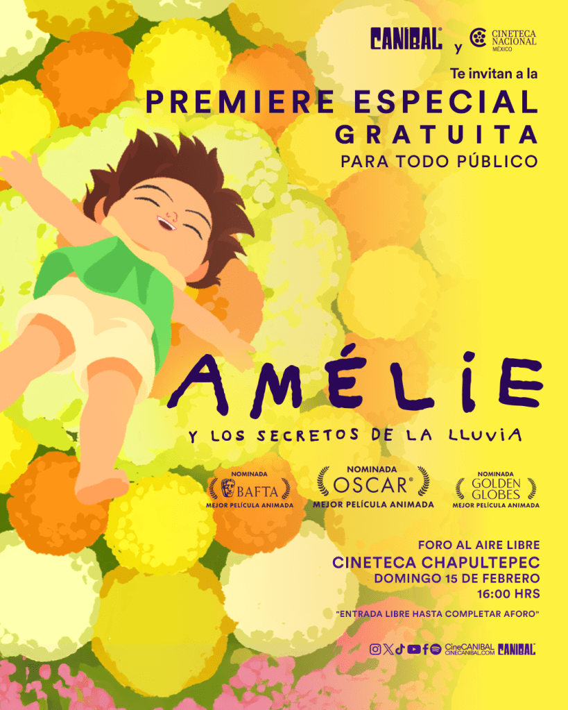 Cine CANÍBAL, en alianza con Cineteca Nacional, anuncia una premiere especial gratuita para todo público de Amélie y los secretos de la lluvia, cinta nominada al Oscar a mejor película animada y que estuvo bajo la producción de la productora mexicana Nidia Santiago.